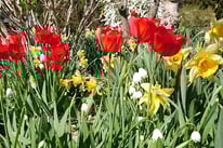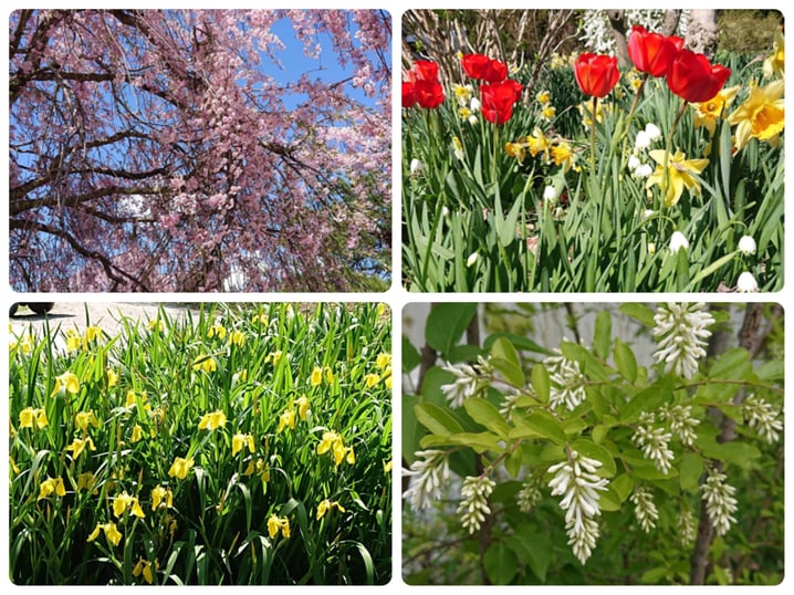 春には桜や藤、チューリップ、ツツジ、ドウダンツツジ、シャクナゲなど多くの花が咲きます。5月には皐月やアヤメ、6月には紫陽花が咲き、秋にはコスモスや紅葉が美しく、冬は一面の雪景色です。